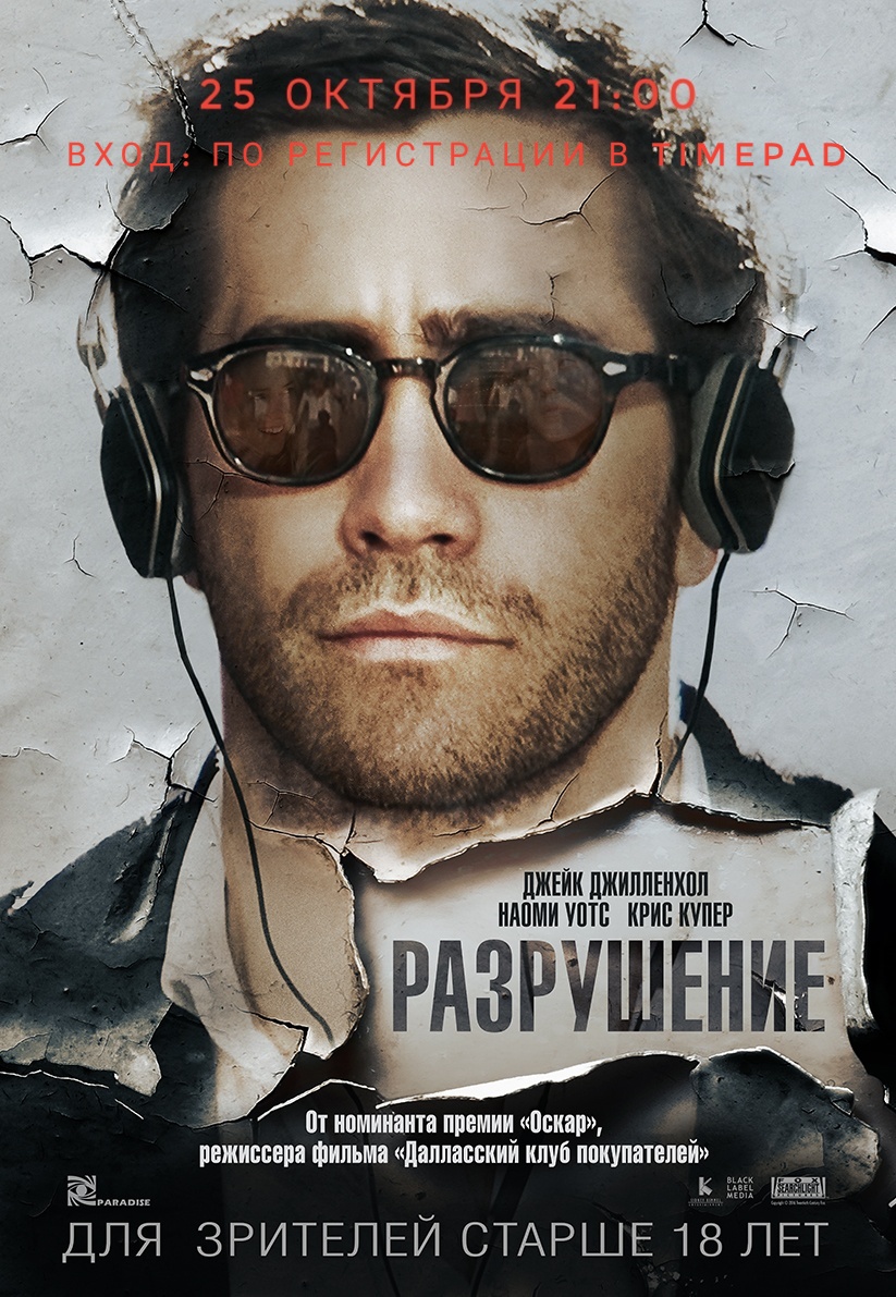 Бенефис Джейка Джилленхола и ода самокопанию от режиссера «Дикой» Жан-Марка Валле. Когда Дэвису сообщили, что он потерял жену в автокатастрофе, он захотел сладкого. Но автомат с шоколадом отказался выдавать ему батончик, в ответ Дэвис пожаловался в компанию, выплеснув всю душу. «Разрушение» разделил критиков: одни ругали фильм за противоречивую мораль, другие – восхищались игрой Джилленхола